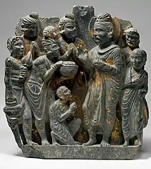 The literary accounts of the life of Gautama Buddha vary considerably in details but are mostly consistent in describing the main events.[1] One of the largest surviving bodies of artistic depictions is the rather small stone reliefs of Gandharan art, beginning in the 1st century BC and continuing for several centuries. These reliefs probably reflected subjects in paintings, both murals and illustrating manuscripts, none of which survive.[2] Their range of about 50 subjects is large,[3] and very rarely exceeded in later art, except in the 120 large reliefs at Borobudor in Java, Indonesia, (but 27 of these are of subjects before his birth); in East Asian Buddhism some new biographical subjects appeared much later, but otherwise the Gandharan subjects include the great majority of scenes appearing later.[4]