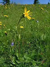 In the subalpine zone, meadows or pastures are almost all of human origin. The plant species present in this environment vary according to exposure, the nature of the soil, and the humidity of the climate. In general, mowing favors plants with bulbs that flower very early in the spring (crocuses) or very late (colchicums). The pastures, subjected to even stronger pressures, favor the emergence of tough species that the animals neglect, such as matgrass. This is often accompanied by mountain arnica or wolf's bane. Wet places are the domain of the megaphorbs, characterized by tall plants (Adenostyles alliariae, Cicerbita alpina, Aconitum napellus, Thalictrum aquilegiifolium, Delphinium elatum, etc.). Finally, in places where livestock stay for a long time, the abundantly smoky soil is very rich in nitrogen and is suitable for species such as Rumex alpinus, Chenopodium bonus-henricus, and Cirsium spinosissimum.