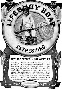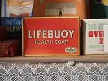 Lifebuoy was introduced by Lever Brothers in 1895 in the United Kingdom. Originally a carbolic soap containing phenol, different varieties were later introduced without the medicinal carbolic smell, such as the coral-coloured Lifebuoy during the late 1950s and Lifebuoy Minty Refresher in 1966.[2] Lifebuoy was one of the most popular soaps in the United States from approximately 1923 to the mid-‘50s,[3] when perfumed soaps took over the market. It was the best selling medicated/health soap in North America until roughly 1951. It was well known for its red and yellow packaging, red color and octagonal shape, as well as its carbolic aroma. Sometime in 1951 or 1952, due to declining sales, Lever Bros. experimented with adding perfumes to the soap, and made the changes permanent in 1954. Earlier experiments in 1936, 1938, 1939 and 1940 also added an artificial scent to the soap, but generally lasted only one batch. Sales, however, continued to decline until 2006, when Lifebuoy was officially completely pulled from the American market. Lifebuoy's popularity reached its peak between 1932 and 1948. After World War Two, when more materials were available and rationing was over, other soaps began to take hold of the market. Its popularity waned steadily through the 1950s. In the mid/late 1960s it saw a popularity surge which would last through 1973. This was, in part, caused by the introduction and success of Lifebuoy White in the American market. After this decline, the Lifebuoy brand was seen less and less in the American market. It was pulled from American shelves starting in 2003 and was completely phased out of the American market by 2006. Sometime in 2008 or 2009, Unilever released Lifebuoy Classic, a modern soap with retro packaging and a medicated scent intended to be similar to that of the 1950s product, as a tie-in novelty product sold through the official A Christmas Story website.