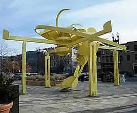 Lift Off is a yellow, canopy like, abstract sculpture that sits on the corner of the CityVista building in front of Busboys and Poets. A welded (3/8-inch x 1/2-inch) aluminum plate with four crossbeams form the main skeleton of the work. Each crossbeam features a small floodlight on the end which illuminates the scallop like, origami inspired parts.