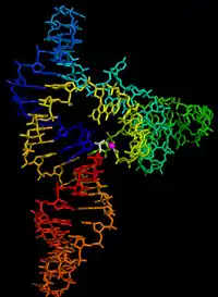 Michael Robertson and Andrew Ellington evolved a ligase ribozyme that performs the desired 5′–3′ RNA assembly reaction, and called this the L1 ligase.[1] To better understand the details of how this ribozyme folds into a structure that permits it to catalyze this fundamental reaction, the X-ray crystal structure has been solved.[2][3] The structure is composed of three helical stems called stem A, B and C, that connect at a three helix junction.