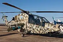 Equipped with a two-person tandem cockpit to accommodate a pilot and co-pilot/gunner, it has been developed to perform both the anti-infantry and anti-armour missions.[53] In addition to these roles, the LCH is intended to be used for a variety of operational purposes, such as to perform air defence against slow-moving aerial targets, including both manned aircraft and unmanned aerial vehicles (UAVs), participation in counter-insurgency operations (COIN) and Counter Surface Force Operations (CSFO),[54] the destruction of enemy air defence operations and wider offensive use during urban warfare conditions, escort to special heliborne operations (SHBO), support of combat search and rescue (CSAR) operations, and armed aerial scouting duties.[55] In terms of its basic configuration, the LCH possesses a relatively narrow fuselage and is equipped with stealth profiling, armour protection, and is equipped to conduct day-and-night combat operations. According to reports, the protective measures included in the rotorcraft includes a digital camouflage system, an infrared (IR) suppressor fitted to the engine exhaust, and an exterior covered by canted flat panels to minimise its radar cross-section (RCS).[53][56] It is furnished with an integrated dynamic system, including a hingeless main rotor and bearing-less tail rotor, which works in conjunction with an anti-resonance isolation system to dampen vibrations.[53] During Aero India 2011, HAL's Rotary Wing Research & Design Centre informed the press that the LCH is "probably the most agile design in the world because of its rotor".[57]