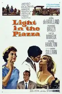 Light in the Piazza is a 1962 American romantic comedy-drama film directed by Guy Green and starring Olivia de Havilland, Rossano Brazzi, Yvette Mimieux, George Hamilton, and Barry Sullivan. Based on the 1960 novel The Light in the Piazza by Elizabeth Spencer, the film is about a beautiful but mentally disabled young American woman traveling in Italy with her mother and the Italian man they meet during one leg of their trip.