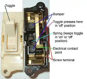 The toggle mechanism provides "snap-action" through the use of an "over-center" geometry. The design was patented in 1916 by William J. Newton and Morris Goldberg.[3] The switch actuator does not control the contacts directly, but through an intermediate arrangement of springs and levers. Turning the actuator does not initially cause any motion of the contacts, which in fact continue to be positively held open by the force of the spring. Turning the actuator gradually stretches the spring. When the mechanism passes over the center point, the spring energy is released and the spring, rather than the actuator, drives the contacts rapidly and forcibly to the closed position with an audible "snapping" sound. This mechanism is safe, reliable, and durable, but produces a loud snap or click.