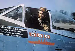 ![]() Colonel J.L. Laughlin, of the 362nd Fighter Group, smokes a cigar with his dog mascot "Prince" inside the cockpit of his P-47D serial 44-33287 "Five By Five" (coded B8-A) | |||||||