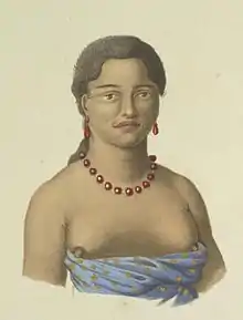 J. Alphonse Pellion, an artist aboard the Uranie, made several engraving sketches of the Hawaiians who visited the ship, including one of Likelike titled Rikériki, femme du chef Kraïmokou (above). He sketched two other chiefesses: Queen Kamāmalu (Kamahamarou), the favorite wife of Kamehameha II, and Keōuawahine (Kéohoua), the wife of Kuakini, Governor of the island of Hawaii.[12] Some of his sketches also depicted traditional signs of mourning such as head shaving and body marking for the recently deceased king.[13]