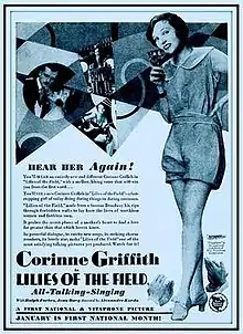 Lilies of the Field is a 1930 American Pre-Code drama film directed by Alexander Korda, and starring Corinne Griffith, Ralph Forbes, and John Loder. It was a remake of the silent 1924 film Lilies of the Field, in which Griffith had played the same role.[1] Both films were based on a 1921 play of the same name by William J. Hurlbut. Lilies of the Field was Griffith's first all-dialogue film. The film is not related in any way to the 1963 film of the same name.