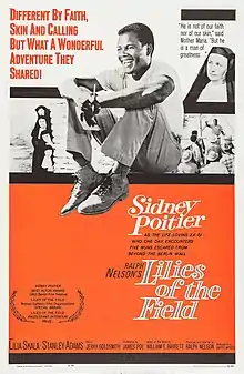 Lilies of the Field is a 1963 American comedy drama film adapted by James Poe from the 1962 novel of the same name by William Edmund Barrett, and stars Sidney Poitier, Lilia Skala, Stanley Adams, and Dan Frazer. It was produced and directed by Ralph Nelson. The title comes from the Sermon on the Mount in the Bible (Matthew 6:27–33 and its parallel scripture from Luke 12:27–31). It features an early film score by prolific composer Jerry Goldsmith.[4] The film was turned into a Broadway musical in 1970, retitled Look to the Lilies, with Shirley Booth in the role of Mother Maria Marthe.