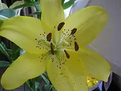 The flowers are large, often fragrant, and come in a wide range of colors including whites, yellows, oranges, pinks, reds and purples. Markings include spots and brush strokes. The plants are late spring- or summer-flowering. Flowers are borne in racemes or umbels at the tip of the stem, with six tepals spreading or reflexed, to give flowers varying from funnel shape to a "Turk's cap". The tepals are free from each other, and bear a nectary at the base of each flower. The ovary is 'superior', borne above the point of attachment of the anthers. The fruit is a three-celled capsule.[6]
