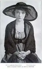Lillian Diana Gish[1] (October 14, 1893 – February 27, 1993) was an American actress,[2] director, and screenwriter. Her film-acting career spanned 75 years, from 1912, in silent film shorts, to 1987. Gish was called the "First Lady of American Cinema", and is credited with pioneering fundamental film performance techniques.[3] In 1999, the American Film Institute ranked Gish as the 17th greatest female movie star of classic Hollywood cinema.