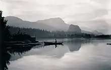 A representative example is Evening on the Columbia, circa 1903 to 1905. The foreground is a large glassy expanse of calm water. The center shows a relaxed figure standing in a rowboat. Near the boat is a rectangular structure topped by a thin bright reflection and a narrow column of white smoke rising into the air. This structure may be White's houseboat. The background shows a rock monolith and low but rugged tree-covered mountains.[5] The Portland Art Museum owns a print of this photograph, along with a number of White's other photographs.[4][6]