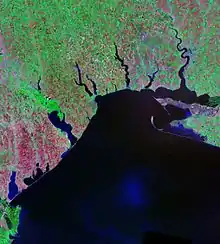 Liman (Russian: лиман; Romanian: liman) is an enlarged estuary formed as a lagoon at the wide mouth of one or several rivers, where flow is constrained by a bar of sediments, as in the Dniester Liman or the Razelm liman. A liman can be maritime (the bar being created by the current of a sea) or fluvial (the bar being created by the slowed or turned flow of a sediment-saturated river).[1] The term describes many wet estuaries in the Black Sea and the Sea of Azov; a synonymous term guba (губа) is used in Russian sources for estuaries of the Russian shores in the north.[2]