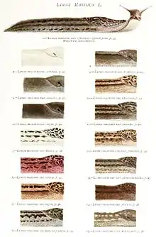 Limax maximus is the type species of the genus Limax. The adult slug measures 10–20 cm (4–8 in) in length and is generally a light greyish or grey-brown with darker spots and blotches, although the coloration and exact patterning of the body of this slug species is quite variable.