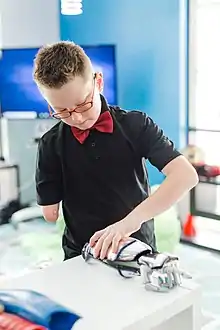 The idea of Limbitless Solutions came to life in 2014 after a team of engineering students at the University of Central Florida led an initiative to provide bionic 3D printed limbs to children. In their free time, the students took advantage of a donated Stratasys Dimension 3D printer in the engineering manufacturing lab on campus to create an affordable prosthetic that displayed their ideas of art and engineering all into one. Their method was the first of its kind and minimized the cost and time of traditional prosthetic manufacturing processes like CNC milling.[4][5] The first 3D printed arm the students created was run with off-the-shelf servos and batteries which are activated by the electromyography muscle energy on the child's limb.[6] Most prosthetic arms are mechanical, which presents a challenge for children without elbows because they have to open and close their mechanical prosthetic by bending their elbow. That led the Limbitless team to come up with the idea for an electronic arm with a muscle sensor that allows the child to open and close their prosthetic hand by flexing their biceps.[7]
