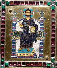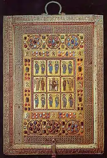The Limburg Staurotheke (from Greek, stauros “cross” and theke “container”) is an example of a Byzantine reliquary, one of the best surviving examples of Byzantine enamel, in the cloisonné technique. It was made sometime in the mid to late 10th century in Constantinople. The box measures 48 cm (19 in) by 38 cm (15 in) and has a depth of 6 cm (2.4 in). This reliquary design was common in Byzantium beginning in the 9th century.[1] It was probably brought to Germany as loot from the Fourth Crusade, and is now in the diocesan museum of Limburg an der Lahn in Hesse, Germany.