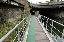 In 1849 James Rendel was asked to devise a scheme to improve the infrastructure, which was dilapidated. He reported that "if [the Navigation] is to compete successfully with Railways, it should be made an efficient branch of the Thames, viz. navigable by the largest class of barges there employed".[24] He proposed, besides numerous improvements on the river proper, the reconstruction of Bromley Lock; deepening the Limehouse Cut; forming a towing path under Britannia Bridge (Commercial Road); and the construction of a new outfall lock into the Thames, with cills 19 feet below Trinity High Water, and with tide gates.[25]