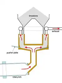 Rotary kilns started to be used for lime manufacture at the start of the 20th century and now account for a large proportion of new installations if energy costs are less important. The early use of simple rotary kilns had the advantages that a much wider range of limestone size could be used, from fines upwards, and undesirable elements such as sulfur can be removed. On the other hand, fuel consumption was relatively high because of poor heat exchange compared with shaft kilns, leading to excessive heat loss in exhaust gases. Old fashioned "long" rotary kilns operate at 7 to 10 MJ/kg. Modern installations partially overcome this disadvantage by adding a preheater, which has the same good solids/gas contact as a shaft kiln, but fuel consumption is still somewhat higher, typically in range of 4.5 to 6 MJ/kg. In the design shown, a circle of shafts (typically 8–15) is arranged around the kiln riser duct. Hot limestone is discharged from the shafts in sequence, by the action of a hydraulic "pusher plate". Kilns of 1000 tonnes per day output are typical. The rotary kiln is the most flexible of any lime kilns able to produce soft, medium, or hard burned as well as dead-burned lime or dolime.