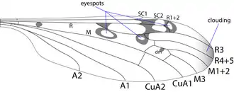 Adult flies are medium to small for crane flies, with a body approximately 8-12mm in length.[7] The mesonotum is a glossy yellow and has four brown markings on either end. Four more elongated markings can be found on the scutum facing slightly inwards back towards the mesonotum. Between the mesonotal prescutum and the scutum there is a V-shaped suture distinctive to all Limoniinae. Though many Limonia species have an elongated terminal palpus,[8] those present on L. triocellata are blunt. The antennae consist of 14 segments, characteristic of Limonia genus. Brown patches exist on the wings in addition to the ocelli, especially towards the ends of veins.[7] The tip of the abdomen determines sex, with the male abdomen terminating in a club-shaped hypogium while the female's ends in a pointed ovipositor.[8]
