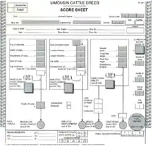 The qualifications RR and RRE are recorded with an animal's description in sales' catalogues and other promotional literature.[45] As a further aid to purchasers of French Limousin genetics, additional qualifications[46] provide a guide to the greatest likely production benefit based on an animal's genetics estimated from on-farm progeny testing. The qualifications are aligned with French market specifications for Limousin beef:[47]