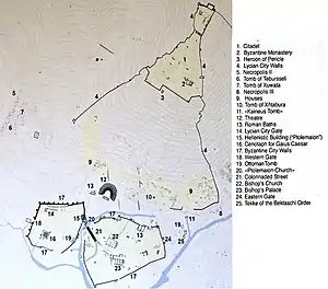 The five necropolises dating from the 4th c. BCE and before demonstrate the city's importance. The mausoleum of Pericles is particularly notable for its fine reliefs and exquisite sculptures such as Perseus slaying Medusa and one of her sisters.[7]