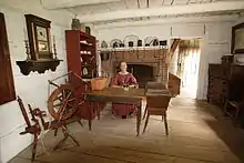 In 1906, William Randolph Hearst purchased the village land and deeded it to the Old Salem Chautauqua Association. In 1919, the land was gifted to the State of Illinois.[5] The site was open to the public on May 19, 1921.[6] Over time, building reconstructions were erected on the foundations of the original village, mostly by the Civilian Conservation Corps, during the Great Depression. The location is presently called Lincoln's New Salem State Historic Site, featuring 23 buildings, mostly log houses and costumed interpreters, representing the era of Lincoln's residency. The cabins, shops, and businesses are furnished by period implements, objects, and furniture, with many acquired from area farms and homes. In addition to the village, the 700 acres (280 ha) park includes extensive woodlands.[7]