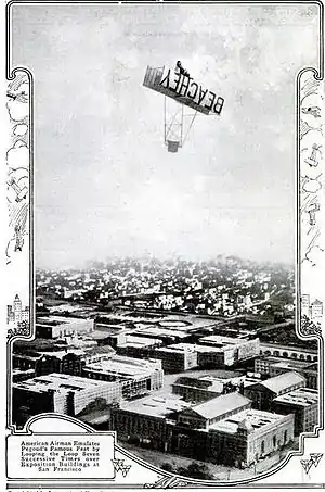 In 1912, Beachey, Parmelee, and aviation pioneer Glenn Martin performed the first night flights in California with acetylene burners, fuses, and small noise making bombs dropped over Los Angeles.[11] In 1913, Beachey took off inside the Machinery Palace on the Exposition grounds at the San Francisco World's Fair. He flew the plane at 60 miles per hour (97 km/h) and landed it, all inside the confines of the hall. His stunt speciality was the "dip-of-death", where he would take his plane up to 5,000 feet (1,500 m), and dive toward the ground at full speed with his hands outstretched. At the last moment he would level the plane and zoom down the raceway, with his hands off of the controls, gripping the control stick with his knees. In a jest aimed at Blanche Stuart Scott, another member of the Curtiss exhibition team, Beachey dressed up as a woman and pretended to be out of control in a mock terror to hundreds of thousands.[12]