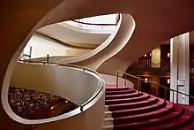 The multi-story lobby is dominated by a concrete and terrazzo cantilevered stairway that connects the main level with the lower level lounges and upper floors.[12] The centerpiece of the lobby is an array of eleven "crystal chandeliers resembling constellations with sparkly moons and satellites spraying out in all directions";[13] the auditorium contains 21 matching chandeliers, the largest of which measures 18 ft (5.5 m) in diameter. The chandeliers were donated by the government of Austria[14] as repayment for American help during the Marshall Plan following World War II,[12] and were designed by Dr. Hans Harald Rath of J. & L. Lobmeyr of Vienna. Twelve of the chandeliers in the auditorium are on motorized winches, and raised to the ceiling prior to performances so as not to obstruct sight lines of the audience on the upper levels.[15]