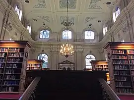 Its library holds some 60,000 books. Graduates and undergraduates are able to work in the building until 2.00 a.m. most nights; the Bodleian and faculty libraries have earlier closing times.[26] It is kept up-to-date by regular purchases, and welcomes suggestions for books pertinent to studies.[27] The upper reading room, or Cohen Room, has an elaborate plastered ceiling and the Senior Library (downstairs) holds some of the college's older books, including pamphlets from the English Civil War, Wesleyana, and plays dating from the late 17th and early 18th centuries, as well as a small collection of manuscripts. The science library is also to be found downstairs. Access to the library is generally restricted to current students and staff at the college, although alumni may use the library if acceptable justification is provided.[28]