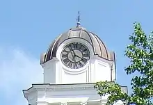 Constructed in the Beaux-Arts architectural style, the building features include a cupola with a clock on each side at the top of the building. The Ionic order portico fronting includes round brick columns.[2]