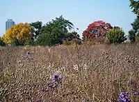 Further north in the park, in the Lake View neighborhood (3600 N), there is the Bill Jarvis Migratory Bird Sanctuary (41°56′56″N 87°38′26″W; formerly, Lincoln Park Addison Migratory Bird Sanctuary).[32] First landscaped and constructed with limited public access in the 1920s, under the leadership of the Chicago Academy of Sciences, its spring is supplied with city water to mimic a natural lake marsh environment, with attendant forest and meadow environments.[33] Most of its 7-acre (2.8 ha) area is entirely fenced around to preserve the habitat from human encroachment. Instead, a nature trail and a viewing platform are at its surrounding perimeter. During the 1940s, its Park District caretakers lost funding and the site was padlocked. In 1968, the entire site was almost bulldozed for golf course development but its Lake View neighbors, including Bill Jarvis, led a successful campaign to save and restore it.[33] Today it hosts more than 150 species of birds, including six species of herons, like the black crowned night heron; wood ducks; woodcock; hawks; yellow-billed cuckoos; hummingbirds; thrushes; vireos; 34 species of warblers; and 18 native species of sparrows. In addition, small mammals such as rabbit, opossum, raccoon, and occasionally fox and coyote make their home there.