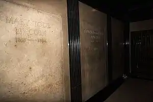 In 1874, upon completion of the memorial, which had been designed by Larkin Goldsmith Mead, Lincoln's remains were interred in a marble sarcophagus in the center of a chamber known as the "catacombs," or burial room.[3] In 1876, however, after two Chicago criminals failed in an attempt to steal Lincoln's body and hold it for ransom, the National Lincoln Monument Association hid it in another part of the memorial, first under wood and other debris and then buried in the ground within the tomb. When Mrs. Lincoln died in 1882, her remains were placed with those of Lincoln, but in 1887 both bodies were reburied in a brick vault beneath the floor of the burial room.[4]