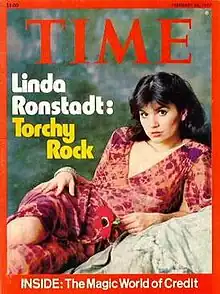 Her 1977 appearance on the cover of Time magazine under the banner "Torchy Rock" was also upsetting to Ronstadt, considering what the image appeared to project about the most famous woman in rock.[14][103] At a time in the industry when men still told women what to sing and what to wear,[104] Ronstadt hated the image of her that was projected to the world on that cover,[14] and she noted recently how the photographer kept forcing her to wear a dress, which was an image she did not want to project.[14] In 2004, she was interviewed for CBS This Morning[105] and stated that this image was not her because she did not sit like that. Asher noted, "Anyone who's met Linda for 10 seconds will know that I couldn't possibly have been her Svengali. She's an extremely determined woman, in every area. To me, she was everything that feminism's about."[104] Qualities which, Asher has stated, were considered a "negative (in a woman at that time), whereas in a man they were perceived as being masterful and bold".[79] Since her solo career had begun, Ronstadt had fought hard to be recognized as a solo female singer in the world of rock, and her portrayal on the Time cover did not appear to help the situation.[76]