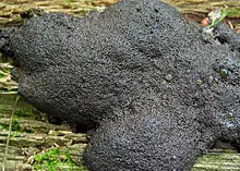 The plasmodium is sepia-toned, brown-black or black. The fruiting body is usually pseudoaethalioid, occasionally aethalioid or on rare occasions even sporangiate. The fruiting bodies form dense groups which are mainly sessile or, rarely, borne on a stipe. The single sporangia are cylindric and create a spotted to cushion-shaped aethalium with a diameter from 1 to 15 cm (0.39 to 5.91 in) and a thickness from 2 to 10 mm. Its thickened, black or dark brown surface is composed of incompletely developed peridium walls and spores, and covers the ochre- to olive-brown interior. The endings of the single sporangia are slightly rough up to distinctly curved outwards and spherical. Their diameter is from 0.4 to 0.8 mm.[1]
