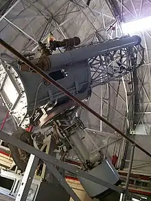 The telescope is a 24-inch (610 mm) diameter reflecting scope with a Nasmyth optical arrangement comprising "an unperforated parabolic glass primary , a 152 mm plano convex secondary and an optical flat which directs the light to an eyepiece assembly on the side of the telescope tube." ( Orchiston 1989 ). The base of the 2.74 metre telescope tube is fashioned from a solid aluminium sheet while the upper extension is constructed in a "cross braced lattice design" ( Orchiston, 1989 ). The telescope utilises an equatorial mount the movement of which is achieved using a number of electric drives. "The main drive wheel contains 720 teeth and is operated by an electric motor, which is accurately timed by a seconds pendulum. A second wheel is used for fast slewing and also has a fine adjustment, while the third wheel is used for positioning the telescope in right ascension according to the setting circle. There is also a prominent declination circle and a declination fast slew motor".[11] Another telescope, an incomplete Schmidt camera, is attached to the 24 inch telescope tube as is a large finder scope initially designed as a telescope in its own right and adapted as a guide scope.[1]