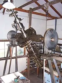 The Observatory building also contains Beames' first telescope constructed in 1934. This instrument is constructed of brass and is also a finely crafted work. A cupboard contains various sights and lenses made by Beames as well as an electrical switch and power board constructed by Beames to power the large telescope and dome and the second pendulum which he designed and constructed to regulate the movement of the main wheel of the telescope mount. The telescope and the observatory building were all designed and manufactured by Beames in his workshops at Five Dock and later the workshops located on the observatory site. The only exception was the machining of the right ascension and declination shafts which were done at Morts Dock. The Observatory building also contains left over boxes of optical components of sighting telescopes and signalling lamps as well as working drawings and notes for his optical work during WWII and the construction and engineering of the telescope and observatory.[1]