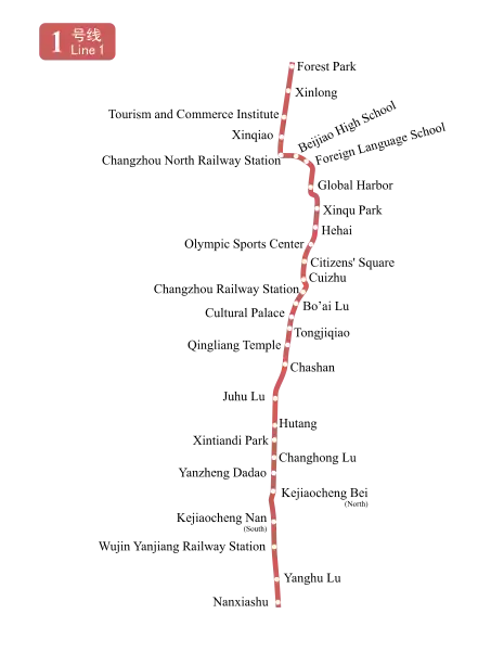 Line 1 of Changzhou Metro (Chinese: 常州地铁1号线; pinyin: Chángzhōu Dìtiě Yī Hào Xiàn) is a rapid transit line in Changzhou. It connects the two railway stations Changzhou and Changzhou North.