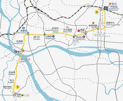 Line 1 of the Guangzhou Metro runs from Xilang to Guangzhou East Railway Station (18.5 km (11.50 mi)). Apart from Kengkou and Xilang, all stations in Line 1 are underground.[4] The first section, from Xilang to Huangsha, opened on 28 June 1997, making Guangzhou the fourth city in mainland China to have a metro system. Construction took a total of 66 months. The total investment is 12.2616 billion yuan with an average cost per kilometer of 662.9 million yuan.[5] The full line started operation on 28 June 1999. Line 1 is coloured yellow.