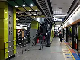 Line 3 is split into two sections, Shiqiao line (main line, from Panyu Square to Tianhe Coach Terminal) and Airport line (northern branch, Tiyu Xilu to Airport North), and are branded with the colour orange. The line is extremely congested, with numerous sections officially operating over 100% capacity.[5] The line uses Seltrac S40 communications-based train control from Alcatel.[6]