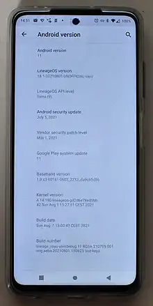 The number of devices supported by LineageOS has increased over time, with 157 for 17.1 and 18.1 as of April 1, 2021.[52][53] Official builds on currently supported development branches are labeled as "nightly". For the first two months of the project, parallel experimental builds were also produced, allowing in-place upgrades from previous CyanogenMod installations and easing migration to LineageOS.[53][54][55][56]