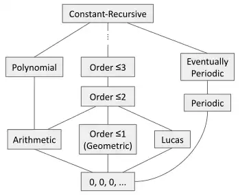 Hasse diagram of some subclasses of constant-recursive sequences, ordered by inclusion