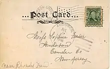 By law, only government-issued postcards were allowed to say "Postal Card".[7] Privately printed postcards were still allowed but they were more expensive to mail (two-cent postage versus one-cent for government cards).[7] Backs of these private cards typically contained the words "Correspondence Card", "Mail Card" or "Souvenir Card"[23][7] The Morgan Envelope Factory of Springfield, Massachusetts, claims to have produced the first American postcard in 1873.[24][25]