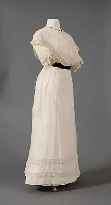The dresses could be bought ready-made or created at home by pattern.[8] They could be accessorized with collars, laces and bows on the neck.[10] Other accessories included lingerie hats and parasols.[11] Dresses were embellished with lace and embroidery, including eyelet embroidery.[5][12][13]