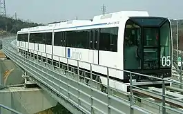 The trains for the line were designed by the Chubu HSST Development Corporation, which also operated a test track in Nagoya.[1] They were built by Nippon Sharyo, cost ¥40.5 billion (US$380 million).[3] The trains are fixed 3-car train sets (Mc1+M+Mc2). The end cars (Mc Car) are 14.0 metres (45 ft 11 in) long and the middle car (M Car) 13.5 metres (44 ft 3 in), giving a total train set length of 43.3 metres (142 ft 1 in).[1] The cars are 2.6 metres (8 ft 6 in) wide. The Mc car has a capacity of 34 seated and 46 standing, and the M car 36 seated and 48 standing, for a total capacity per train set of 244.[1] The cars have a semi-monocoque construction of welded aluminum, with two emergency doors at each car end and two 1,200-millimetre (47 in) doors per side.[1]