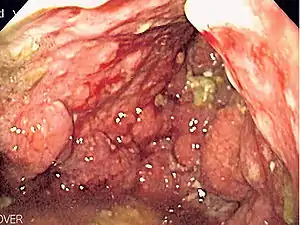 | Endoscopic image of linitis plastica, where the entire stomach is invaded with stomach cancer, leading to a leather bottle like appearance | |