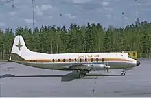 Flight 618 was a domestic scheduled passenger flight on 15 January 1977.[1] It was conducted using a Vickers 838 Viscount with registration SE-FOZ and serial number 372. The aircraft was bought used by Skyline in 1976 to replace an existing, small Viscount 784.[1] With a first flight in 1961, it had flown 12,208 hours at the time of the accident.[2] Flight 618 was to fly from Malmö Sturup Airport to Stockholm Bromma Airport, with intermediate stops at Kristianstad Airport, Växjö Småland Airport and Jönköping Airport. The flight commenced as nominal until descent to Bromma. At this time there were nineteen passengers and a crew of three on board,[1] including the well-known table tennis player Hans Alsér.[3]