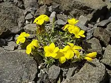 Linum cariense is a small perennial plant which grows in a cushion manner from 1–6 cm (0.39–2.36 in). The leaves are usually a dull grey-blue color and are 5–12 mm (0.20–0.47 in) long with tiny hairs. Each leaf is tipped by what appears to be a small brown gland. Each flower is yellow and approximately 1.5–2.5 cm (0.59–0.98 in) across. The flowers are typically in clusters of three or more, differentiating the species from the very similar Linum verruciferum which has singular flowers.[2]