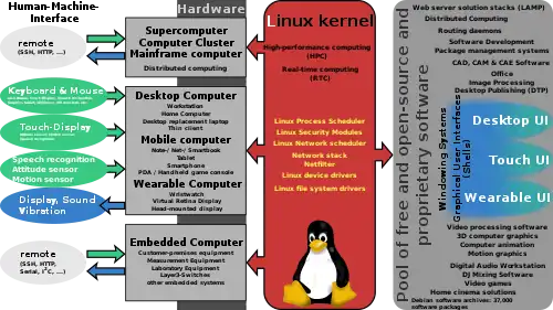 | Other components: ALSA, DRI, evdev, klibc, LVM, device mapper, Linux Network Scheduler, Netfilter Linux Security Modules: SELinux, TOMOYO, AppArmor, Smack | ||||||