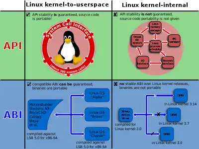 The Linux Application binary interface (ABI) between the kernel and the user space has four degrees of stability (stable, testing, obsolete, removed);[101] however, the system calls are expected to never change in order to not break the userspace programs that rely on them.[102]