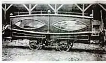 After a lengthy debate, Linwood Cemetery was connected to the Christchurch tramway system. Approval for construction of the line was given in April 1885.[8] Construction began on 26 November 1885 at Latimer Square and was completed by March 1886. The line was officially opened on 23 April 1886. Initially, it was the 'end of the line' from the city centre and people had to walk across or around the cemetery to connect with the tram line to New Brighton, which was run by a different company. By January 1887, the two lines had been connected.[9] The city council had a tram hearse built for up to four coffins, with the intention of providing cheaper form of transport to the cemetery than what funeral directors would charge. The scheme was a failure and it is believed that the tram hearse was never used. In 1888, a council committee recommended that the rails into the cemetery be removed again and used elsewhere, but this was never acted on, and the rails, although sealed over, are still faintly visible. The tram hearse was bought by Samuel Paull Andrews for £3 and used as an explosives store in his St Andrew's Hill quarry.[10] It is possibly that Linwood Cemetery is the only one in the world to have had a tram line.