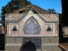 Following recommendations in the Conservation Plan for Linwood Cemetery, local residents who had been tidying and gardening Linwood Cemetery as a Working Group since 1999 formed a charitable trust in November 2006. The trust's vision is to "conserve and maintain the heritage of the Linwood Cemetery for future generations." The Friends of Linwood Cemetery Charitable Trust organise regular working bees at the cemetery, record the condition of graves, record information about the cemetery and those buried in it on its own website, publicise the cemetery through articles and events and raise funds for projects to help preserve valuable heritage aspects of the cemetery.[1][14] In November 2011 Dulux donated paint to the Trust to paint a trompe l'oeil of the Peacock Mausolem to cover the graffiti on a 'temporary' protective covering. The artwork was carried out by Anne Holloway, the chair at the time. The artwork was finished in August 2012. Bob Todd the Chair of the Hagley Ferrymead Community Board unveiled the artwork in a ceremony in May 2012 before the signwriting was completed by Digby Gemmel in the following months.